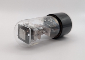 The HB-105 is a so-called Pixie tube manufactured by Burroughs. Unlike a Nixie tube, which forms numerals from a stack of digit-shaped cathodes, the Pixie tube uses a single anode plate perforated with digit-shaped holes, through which a neon discharge can be seen. The tube’s datasheet lists its various supposed advantages over Nixie tubes which included the ability to display multiple digits simultaneously and its low operating current. Additionally, it was significantly cheaper than conventional Nixie tubes at the time.