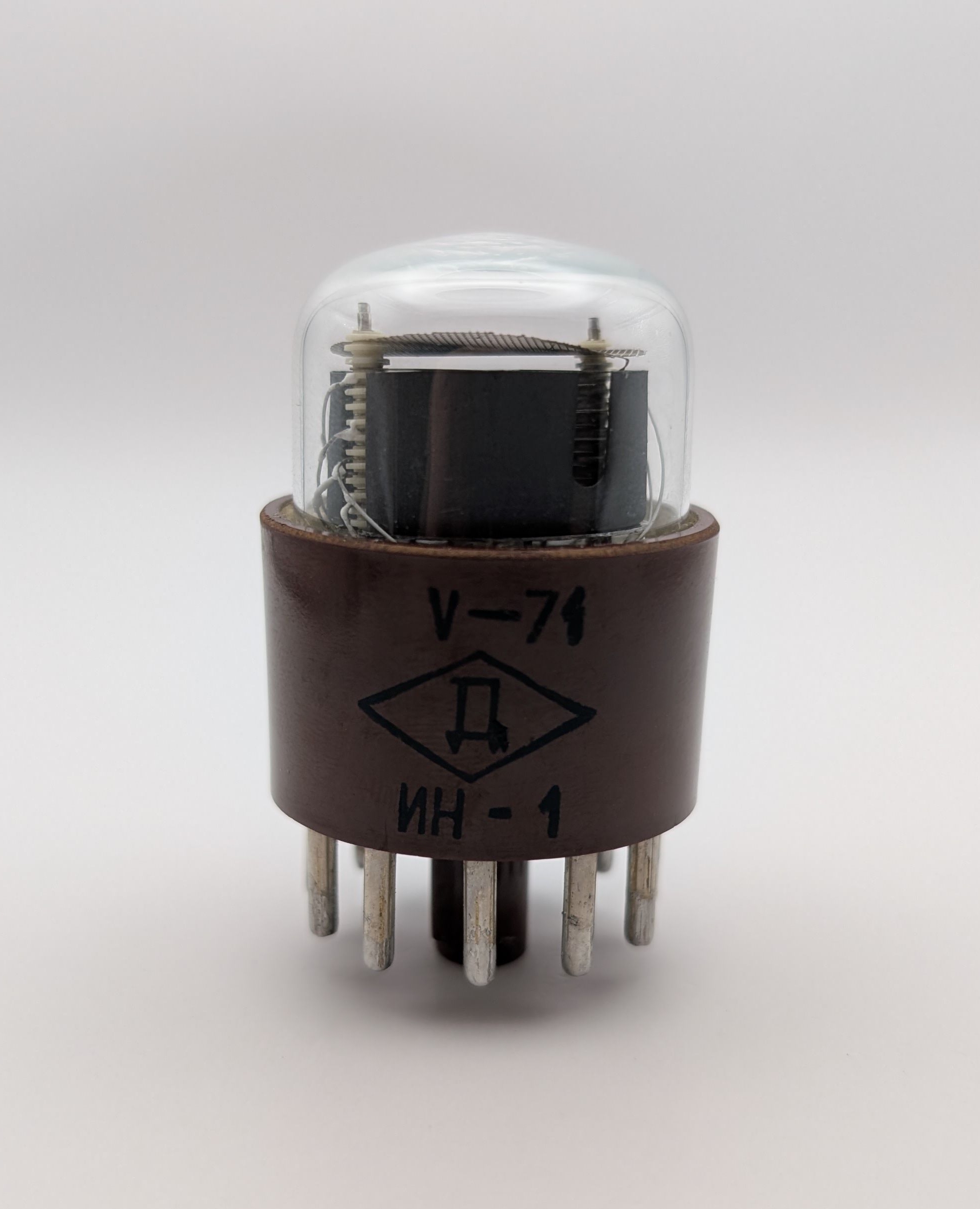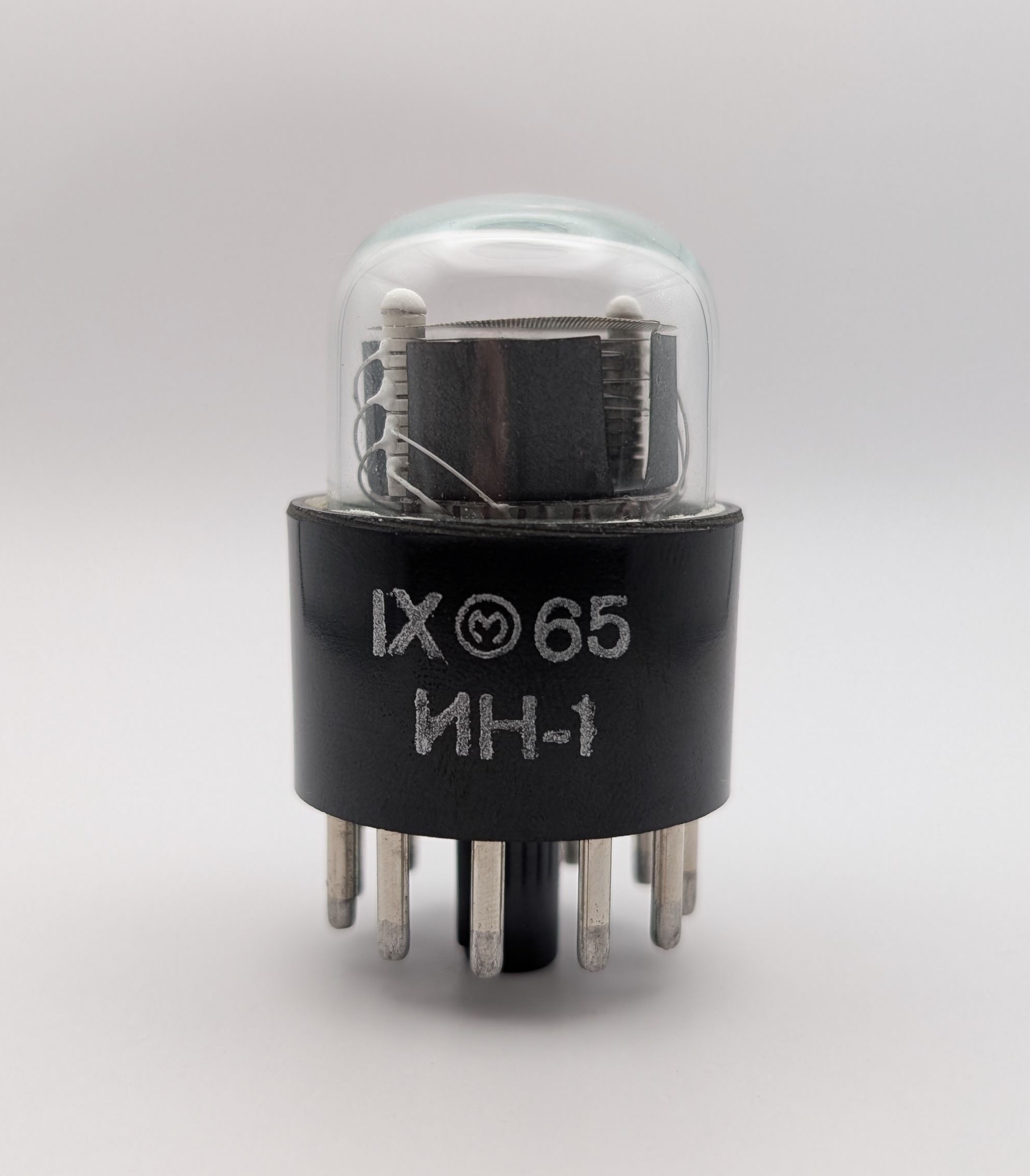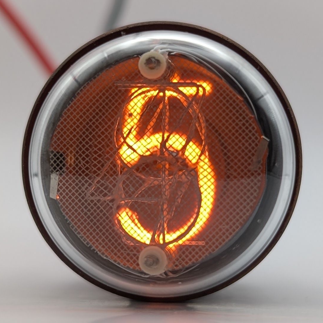 The IN-1 (“NH-1”) is the first generation of Nixie tube mass-produced in the Soviet Union by Anod. Like many other Soviet Nixie tubes, the IN-1 utilizes an inverted two to represent the number five, although at least some earlier models featured a proper five. This tube is notable for its large phenolic base, with each pin conveniently numbered. As is typical of early Nixie tube designs, the IN-1’s gas mixture lacks mercury vapor, which results in reduced longevity. It is, however, pin-compatible with and visually very similar to the Dolam LC-516, which could be considered as a longer-lasting alternative for those who appreciate the IN-1’s UFO-like design. Original U11 sockets are notoriously difficult to come by so building a device using either of them would likely require coming up with a custom made socket design.