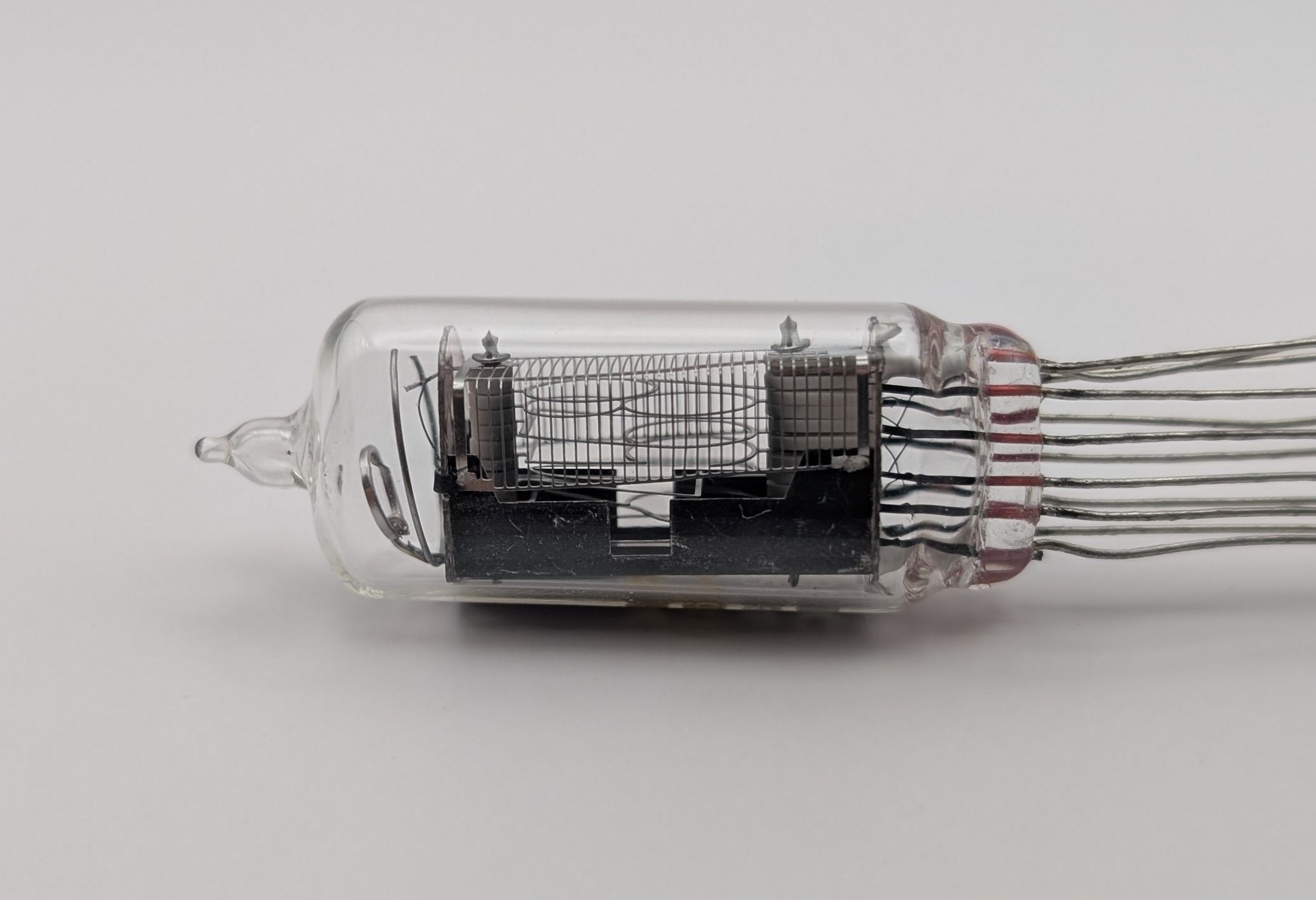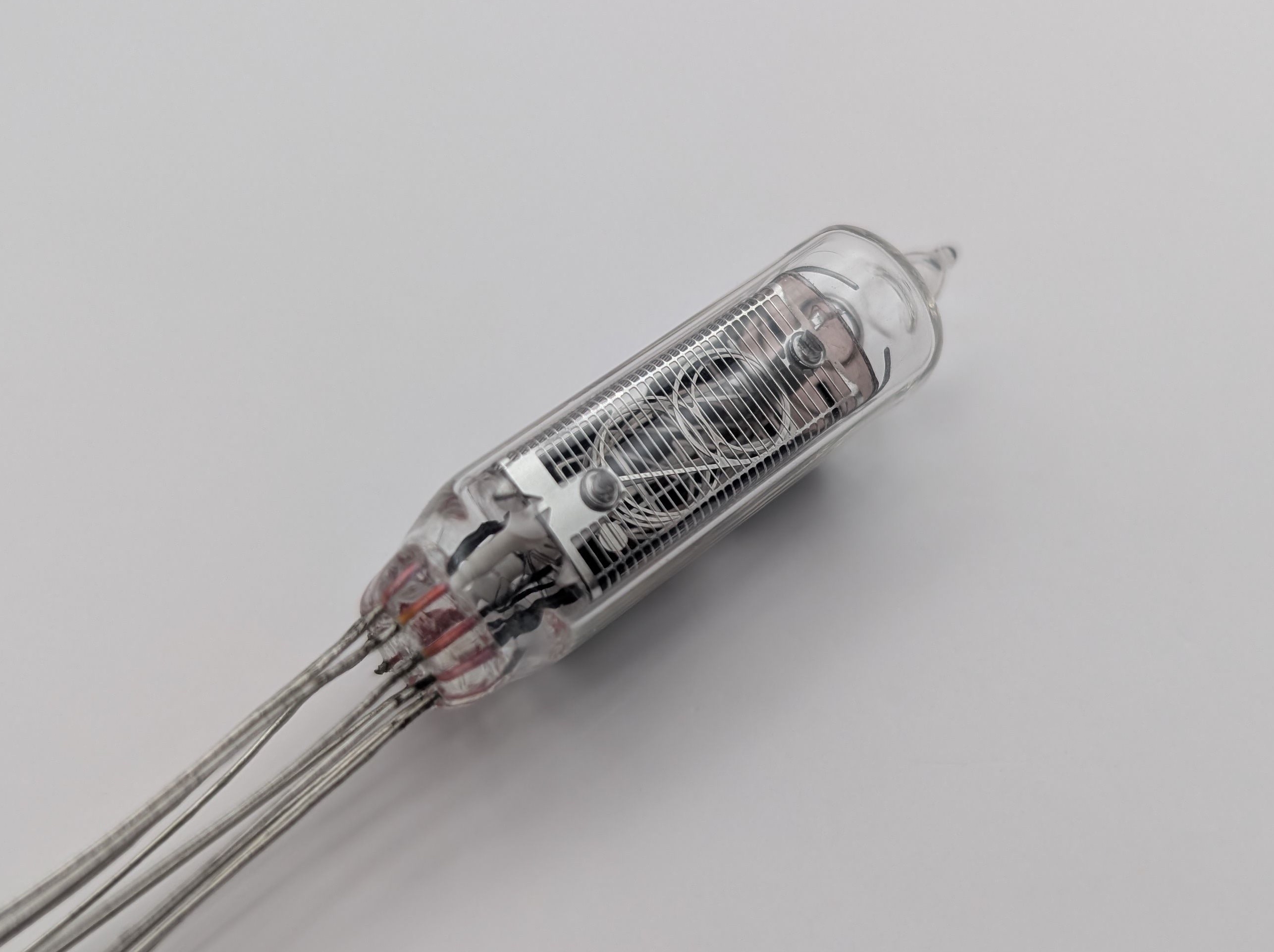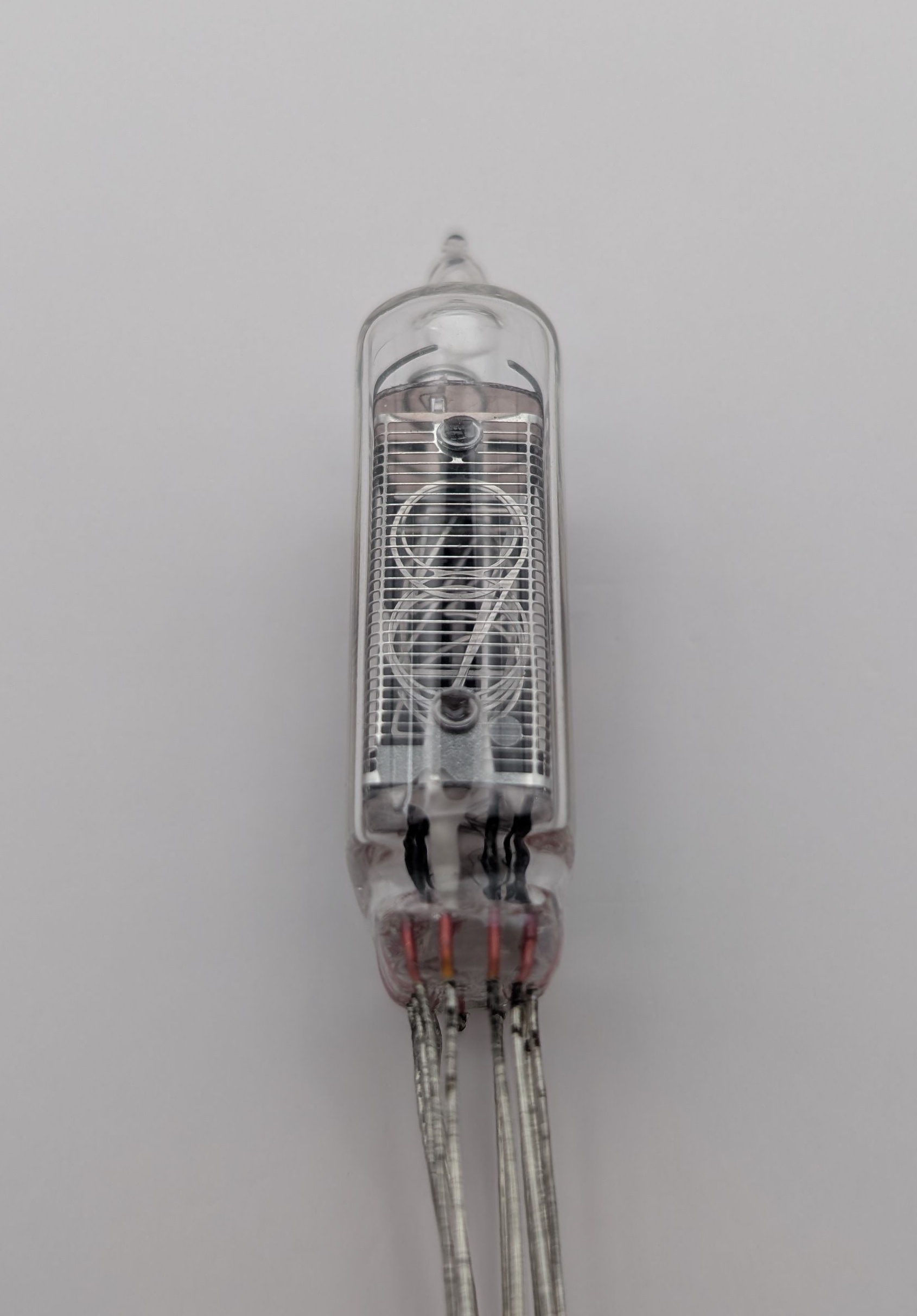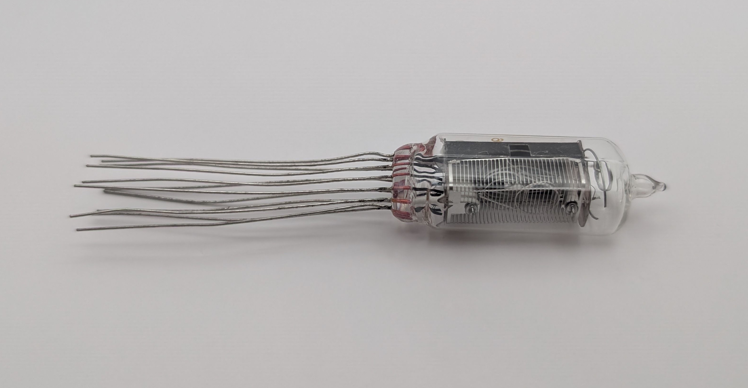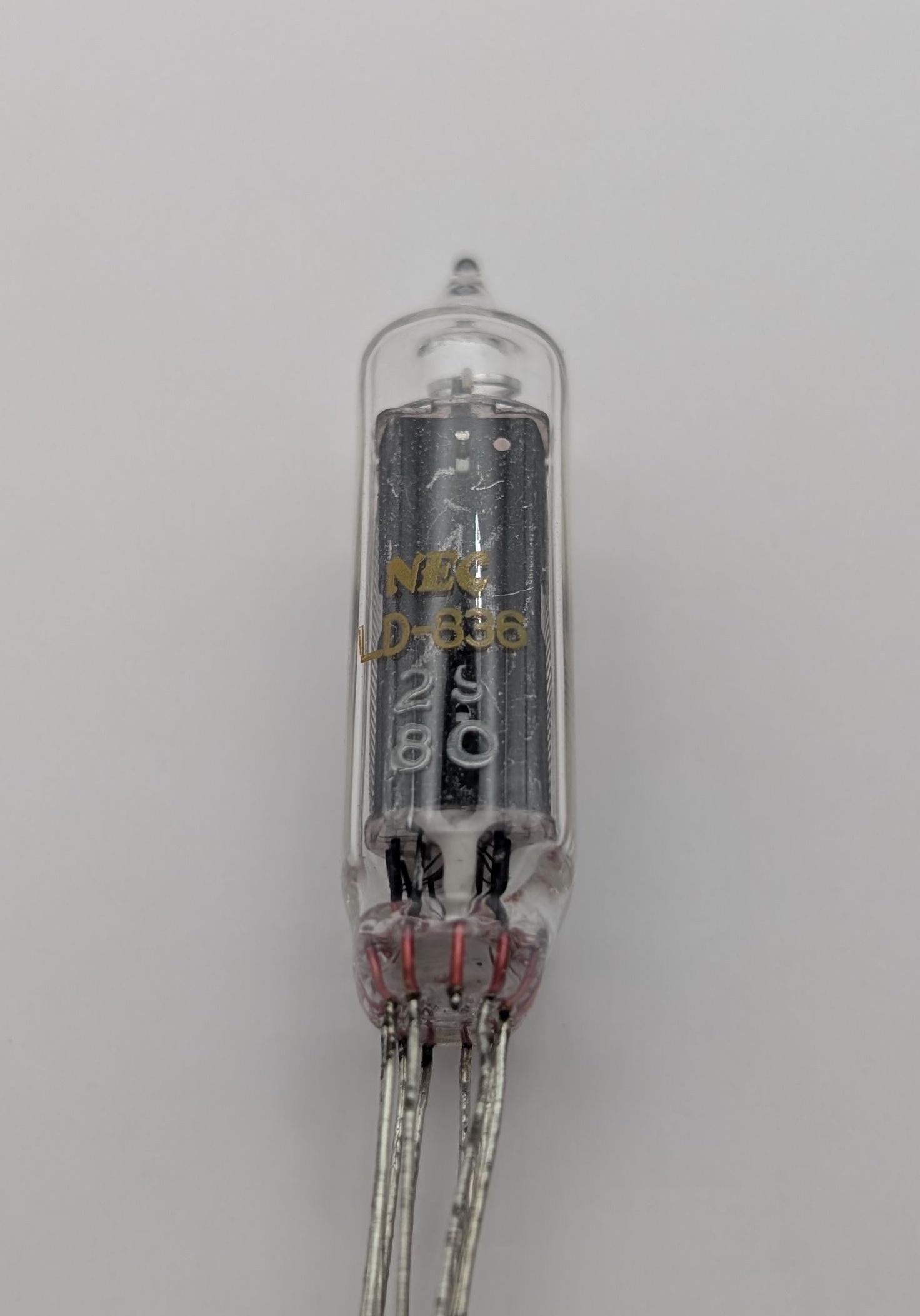 The LD-836 is a medium-sized Nixie tube manufacured by NEC in Japan, notable for its highly unusual, nearly rectangular glass envelope. This distinctive shape makes the tube’s front face significantly narrower than that of comparable Nixies and allows multiple tubes to be placed closer together in display assemblies. In addition to displaying the digits 0 through 9, the LD-836 also includes a right-hand decimal point. Its internal design closely resembles that of NEC’s CD66A, sharing a similar wire anode assembly, which leads to significantly improved digit visibility compared to the more typical grid design. The LD-836 is an exceptionally rare Nixie tube, with barely any information being available on it publicly.